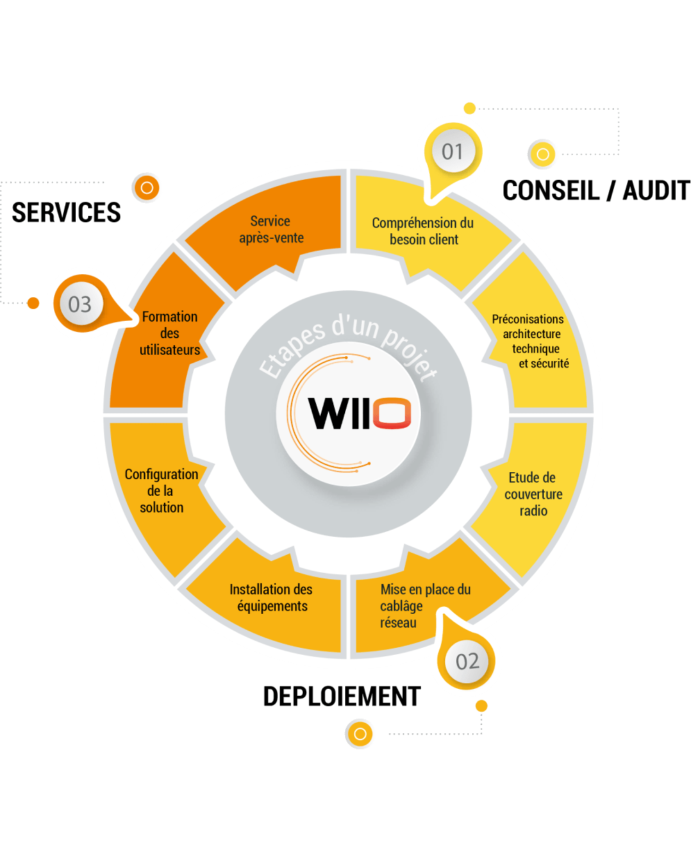 Chez WIIO, nous commençons par une phase de conseil et d’audit approfondi. Cela nous permet de comprendre vos besoins et de préconiser une architecture technique et de sécurité adaptée à votre entreprise. Nous étudions également la couverture radio en fonction des terminaux préconisés, en prenant en compte leur sensibilité radio. Une fois que nous avons établi la solution optimale, nous passons à la phase de déploiement. Celle-ci consiste à mettre en place le câblage réseau, à installer les équipements (points d’accès et contrôleur Wi-Fi) et à configurer l’ensemble de la solution.